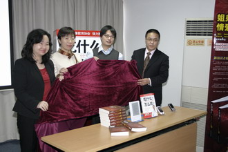 方正阿帕比助理總經(jīng)理赫思佳(左一)與通訊廠(chǎng)商代表及出版社領(lǐng)導共同為新書(shū)揭幕